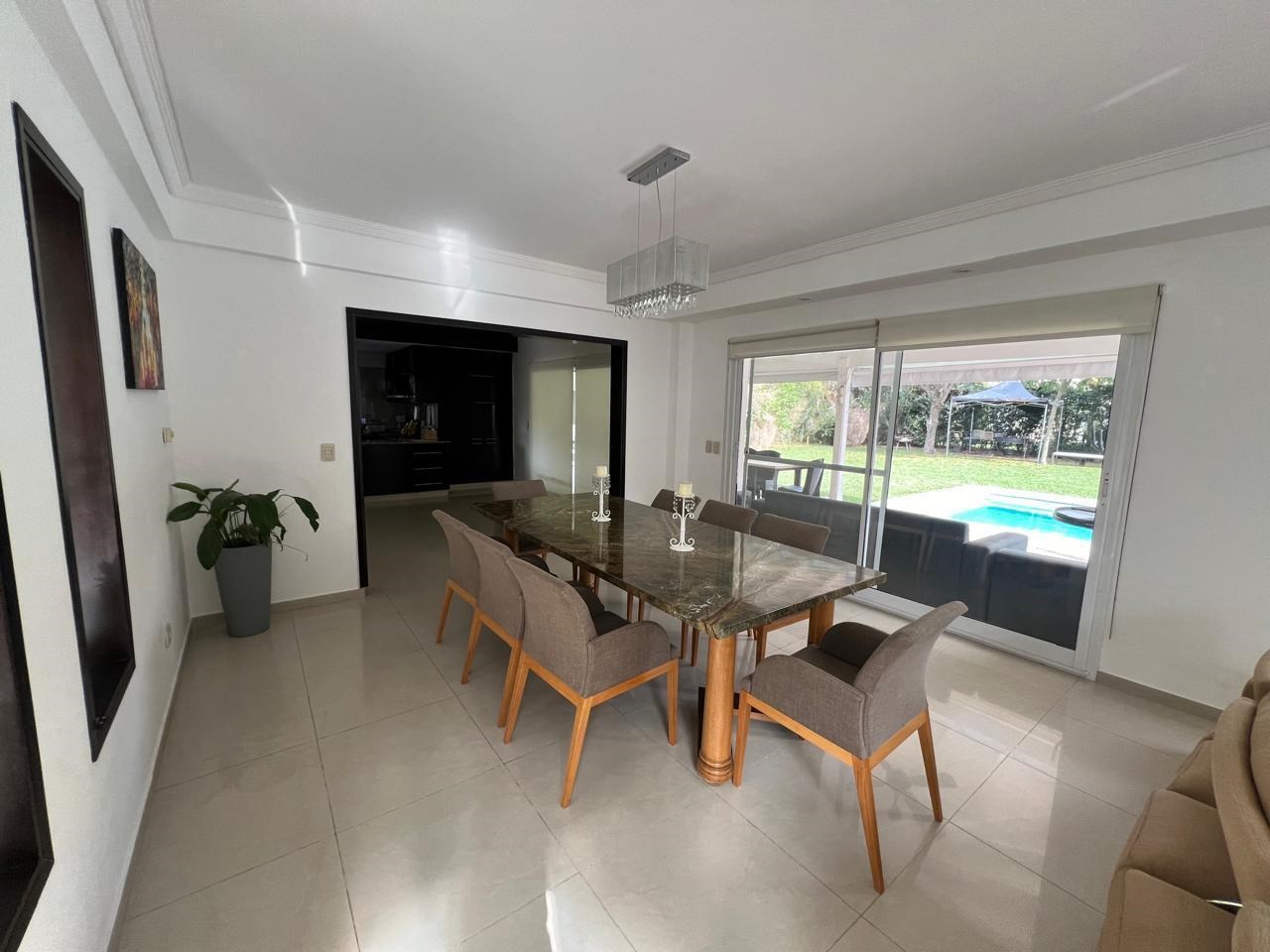 ALQUILER TEMPORAL, BARRIO SEPTIEMBRE Casa en dos plantas ubicada en exelente barrio a metros de panamericana. Posee un amplio parque con galeria cubierta con parrilla, cuenta con pileta con playa humeda, solarium y ducha exterior. en su interior cuenta con 4 dormitorios y uno en suite con vestidor , baño completo todo en planta alta. En planta baja cuenta con cocina, lavadero amplio completo con baño. Living comedor amplio, biblioteca y toilette. FECHAS DISPONIBLES: MARZO COMPLETO VALORES: SEMANA: U$S 1200 QUINCENA: U$S 1800 MES MARZO: U$S 3000 MAS U$S 350 DEL PROPORCIONAL DE EXPENSAS Y SERVICIOS (QUINCENAL) CONSULTANOS! Las medidas, superficies y montos de impuestos y servicios expresados son aproximadas, y al solo efecto orientativo. Las medidas reales surgirán del título de propiedad respectivo. La venta de este inmueble está sujeta a la tramitación del Código de Transferencia de Inmuebles (COTI), de conformidad con la normativa vigente (Res. AFIP 2371/08, 2439/08 y ccs.) por parte del propietario. MARTILLERO & CORREDOR INMOBILIARIO RESPONSABLE: DE LEO PROPIEDADES Mat. CMCPSI 6150 de Paola De Leo